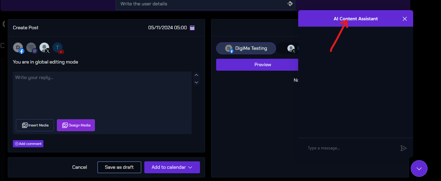 - Manual creation: Write your message in the text box. DigiMe allows you to tailor content for each platform with previews, ensuring it looks perfect.